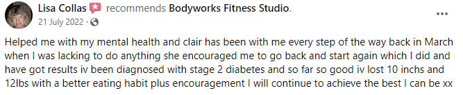 "Thanks to Bodyworks I've down 10 inches in 4 weeks! I can't wait to see the changes after a whole year."